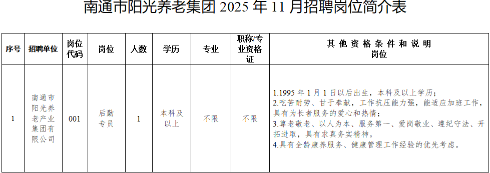 详见附件1《南通市阳光养老集团2025年11月招聘岗位简介表》。