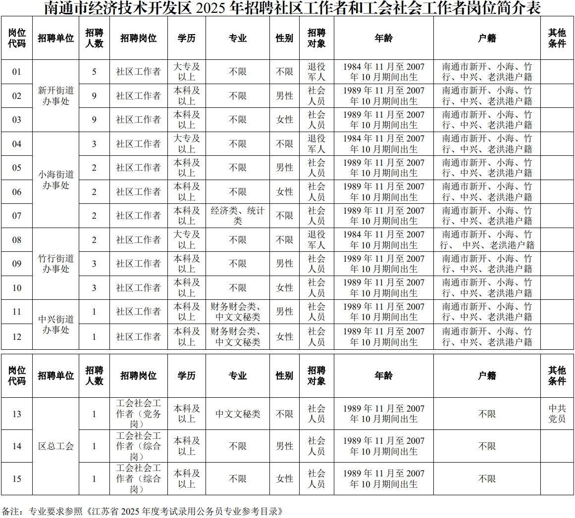 详见《南通市经济技术开发区2025年招聘社区工作者和工会社会工作者岗位简介表》(附件,以下简称《岗位简介表》)