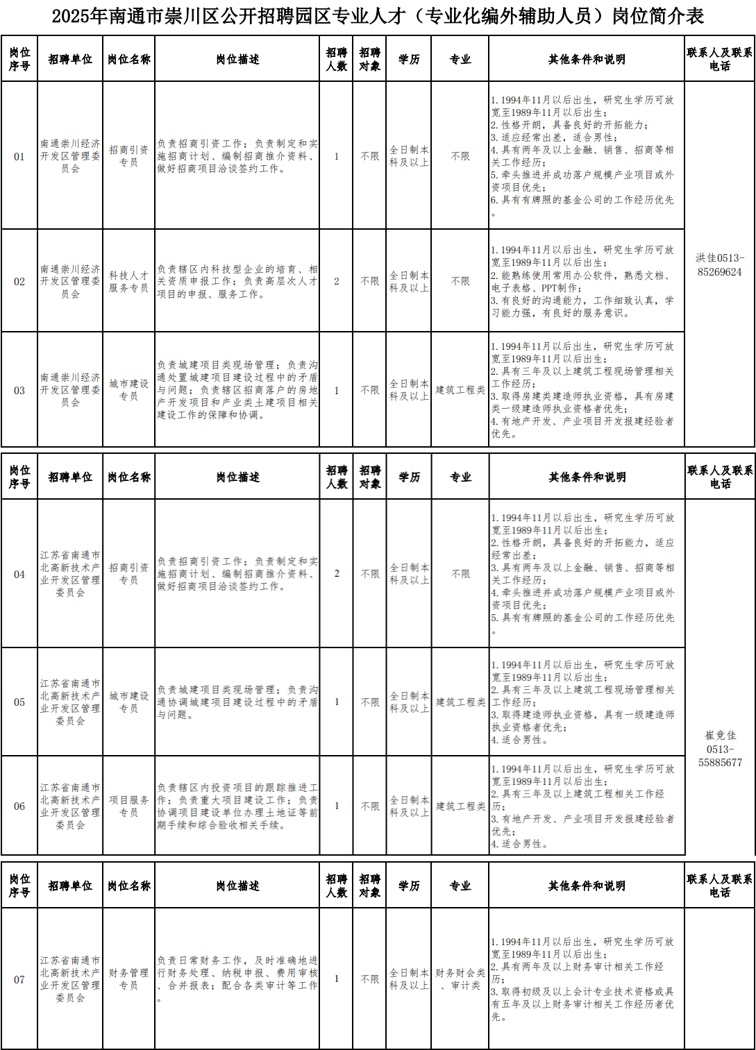 招聘岗位及各岗位招聘条件详见《2025年南通市崇川区公开招聘园区专业人才(专业化编外辅助人员)岗位简介表》(附件1,以下简称《岗位简介表》)。