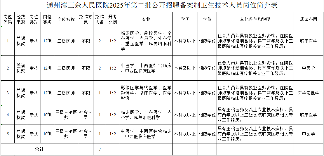 为进一步优化医院人员队伍结构,提升公共服务水平,通州湾三余人民医院2025年面向社会公开招聘备案制工作人员7人。现将有关事项公告如下: