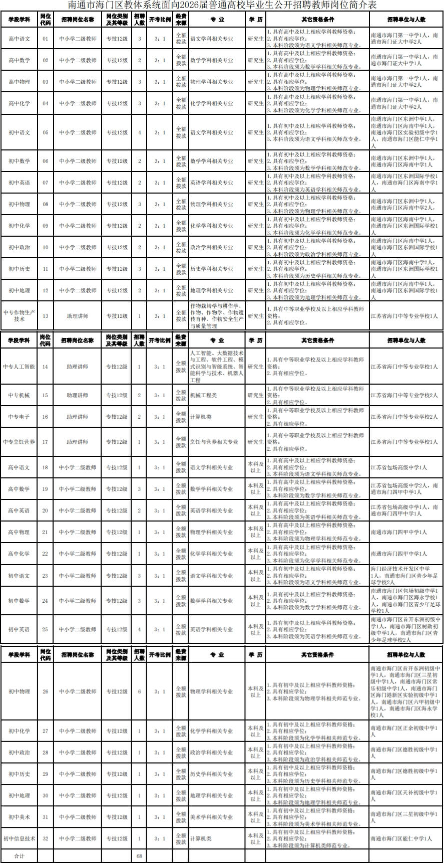 招聘岗位及招聘条件等详见《南通市海门区教体系统面向2026届普通高校毕业生公开招聘教师岗位简介表》(附件1,以下简称《岗位简介表》)。《岗位简介表》在南通市人力资源和社会保障局网站(http://rsj.nantong.gov.cn)、南通市海门区人民政府网站(www.haimen.gov.cn,政府信息公开-法定主动公开内容-招考录用-事业单位招录)、南通市海门区教育体育局网站(www.haimen.gov.cn/hmsjyj/gggs/gggs.html)公告。