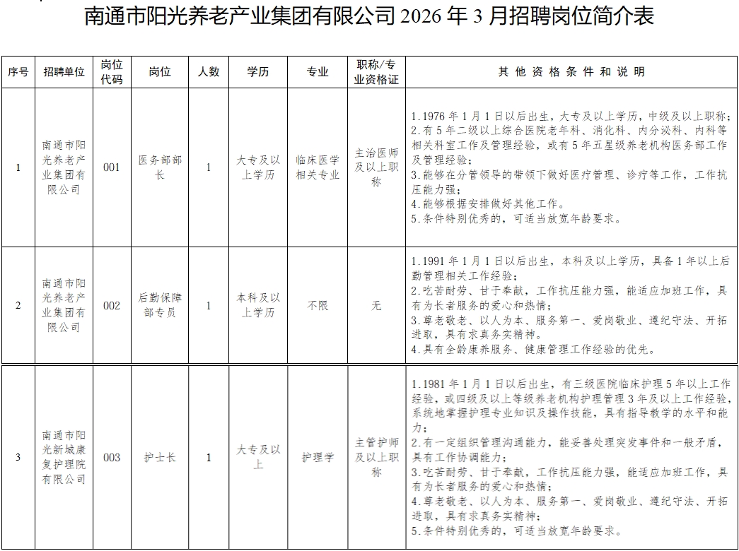详见《南通市阳光养老产业集团有限公司2026年3月公开招聘岗位简介表》(附件1)。