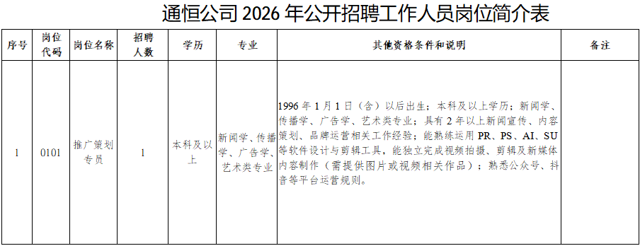 详见附件1《南通市通恒商业管理有限公司2026年公开招聘工作人员岗位简介表》。