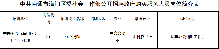 中共南通市海门区委社会工作部现因工作需要,面向社会公开招聘政府购买服务人员1名。现将有关事项公告如下: