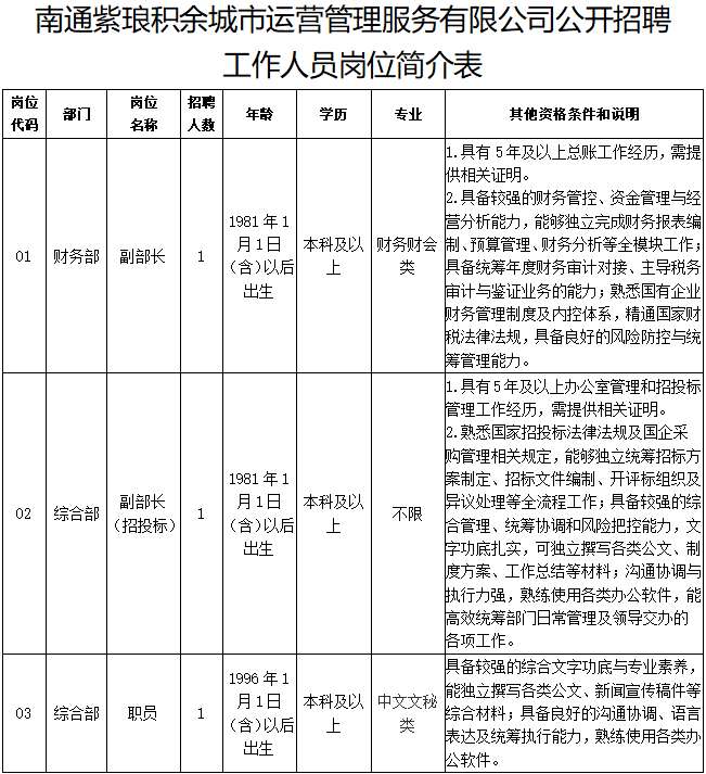 详见《南通紫琅积余城市运营管理服务有限公司公开招聘工作人员岗位简介表》(附件1)。