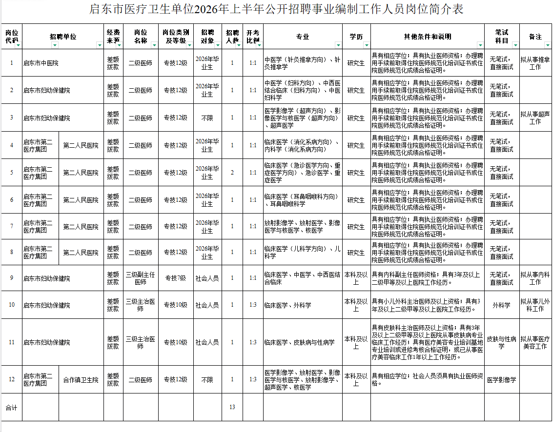 为更好地选拔优秀适岗人才,优化人员队伍结构,提升公共服务水平,根据《江苏省事业单位公开招聘人员办法》(苏办发〔2020〕9号)相关规定,启东市医疗卫生单位2026年上半年公开招聘事业编制工作人员13名。现将有关事项公告如下: