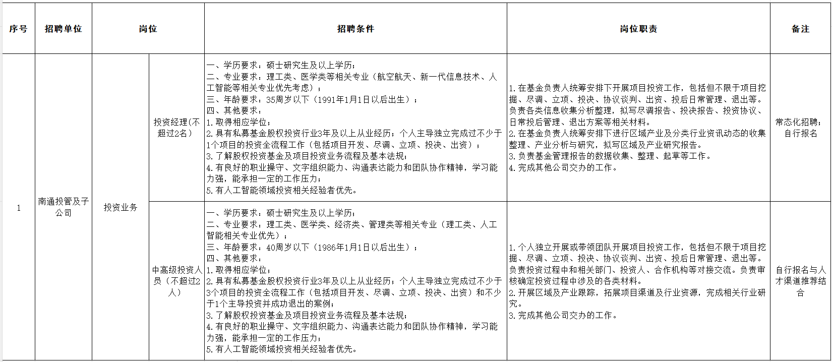 投资业务岗(含投资经理、中高级投资人员),详见附件1岗位简介表。