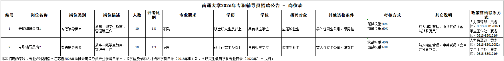 附件:南通大学2026年专职辅导员招聘公告-岗位表