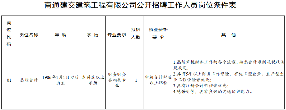 附件1:南通建交建筑工程有限公司公开招聘工作人员岗位条件表