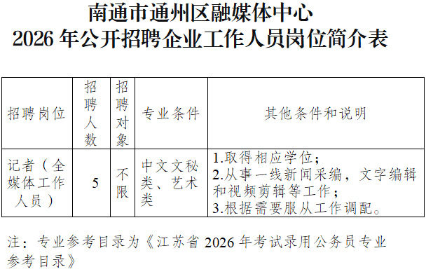 招聘岗位、人数、专业及岗位要求详见《南通市通州区融媒体中心2026年公开招聘企业工作人员岗位简介表》。