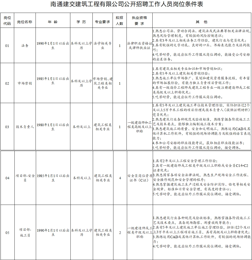 招聘岗位、人数、专业、学历及其他要求等具体信息详见《南通建交建筑工程有限公司公开招聘工作人员岗位条件表》(附件 1)。