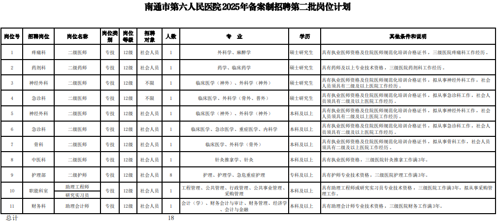 招聘岗位及岗位要求详见附件《南通市第六人民医院2025年第二批公开招聘备案制工作人员岗位简介表》(以下简称《岗位简介表》)。