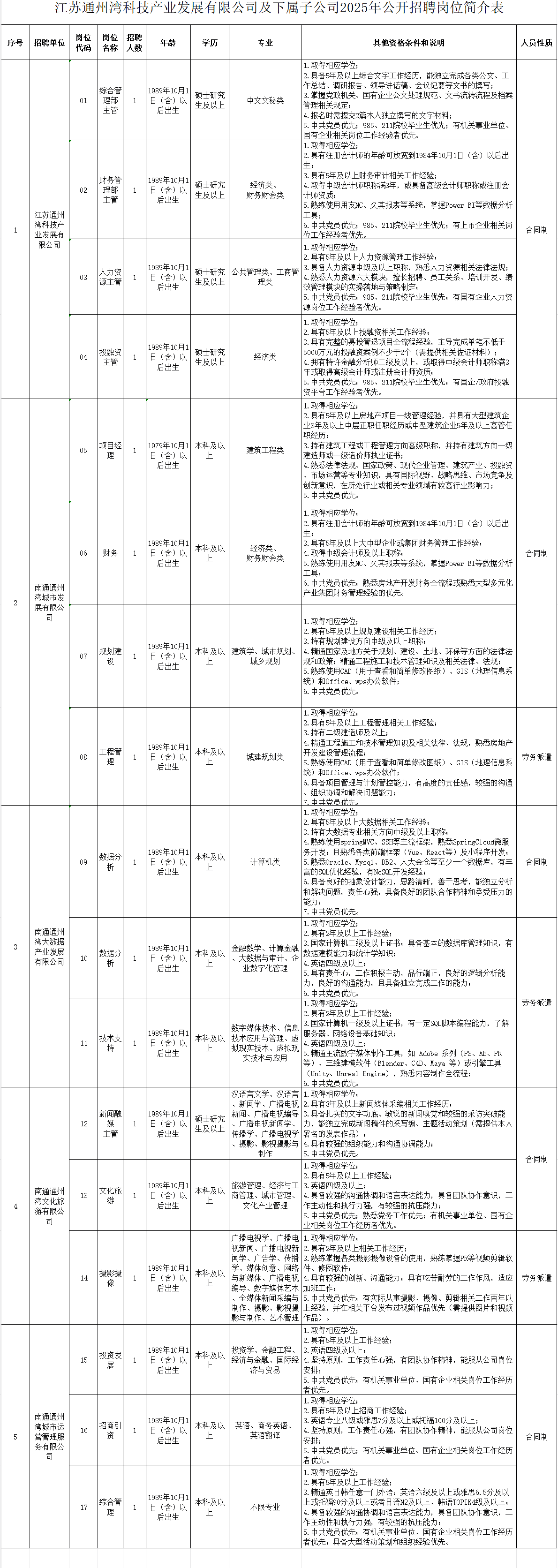 详见《江苏通州湾科技产业发展有限公司及下属子公司2025年公开招聘岗位简介表》(附件1,以下简称《岗位简介表》)。
