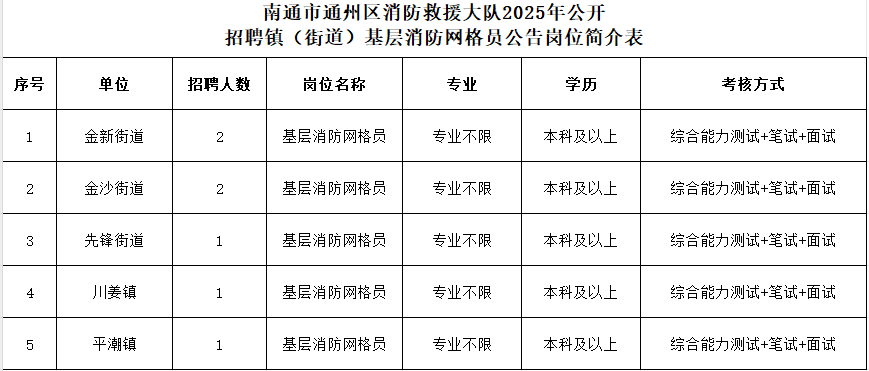 南通市通州区消防救援大队公开招聘镇(街道)基层消防网格员7名