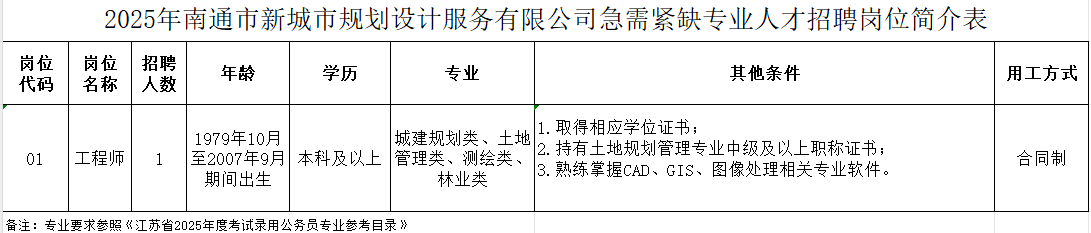 详见《2025年南通市新城市规划设计服务有限公司急需紧缺专业人才招聘岗位简介表》(附件1)。