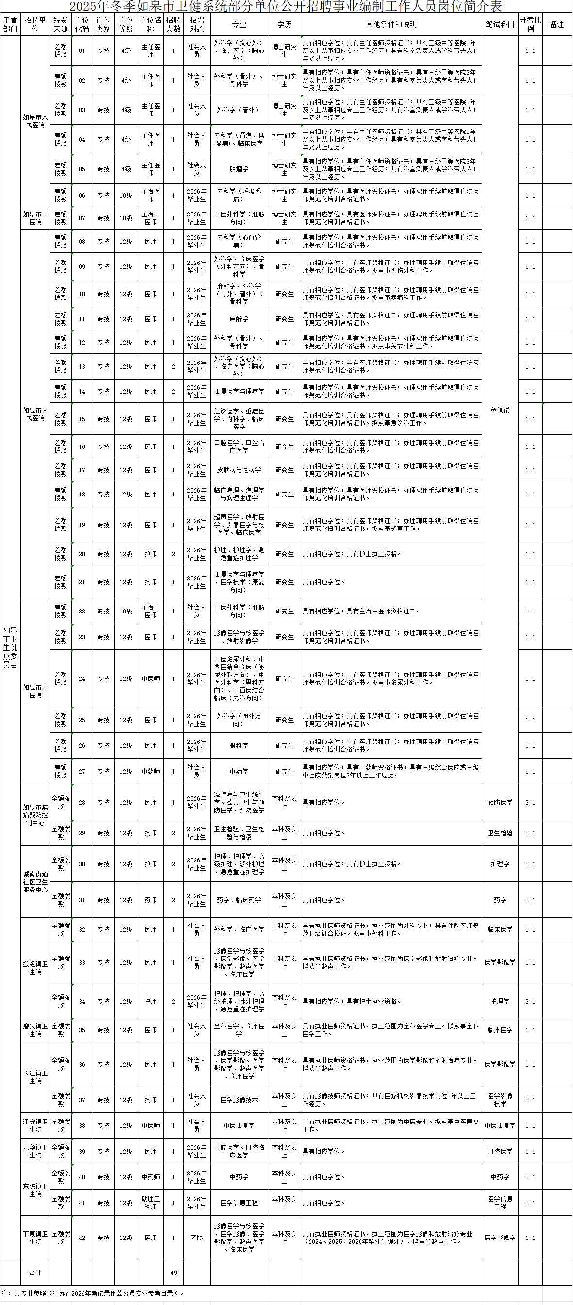 根据《江苏省事业单位公开招聘人员办法》(苏办发〔2020〕9号)相关规定,为更好地选拔优秀适岗人才,进一步优化我市卫健系统人员队伍结构,提升卫生健康服务水平,2025年冬季如皋市卫健系统部分单位公开招聘事业编制工作人员49名。现将有关事项公告如下: