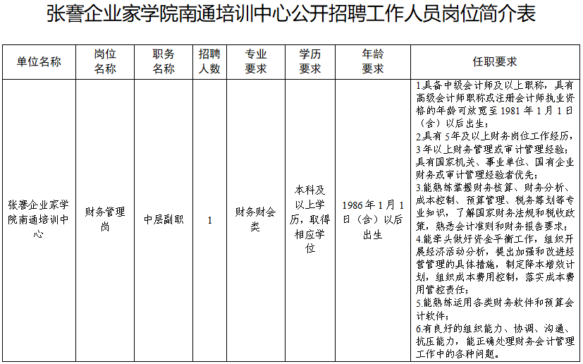 详见《张謇企业家学院南通培训中心公开招聘工作人员岗位简介表》(附件1)。