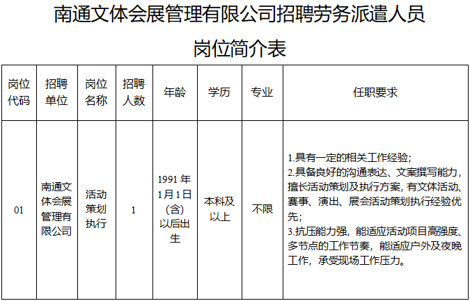 因工作需要,南通文体会展管理有限公司面向社会公开招聘1名劳务派遣人员,有关事宜公告如下: